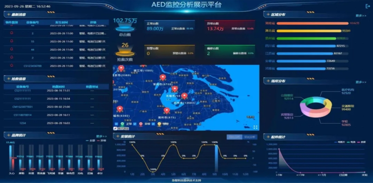 該平台基于“物聯網+大安全”技術架構,深度融合了雲計算、大數據、人工智能等高新技術,集AED管理平台、志願者管理平台、核心數據交換中心(包括一鍵呼救、設備配置、110 / 120聯動、AED地圖、急救宣傳培訓、動态急救網等功能)爲一體。