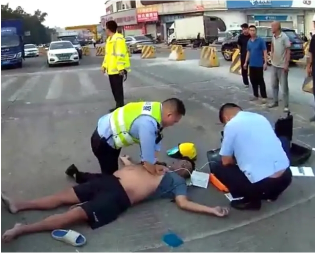 生死關頭,倪曉明一刻也不敢延誤,立即對男子采取心肺複蘇。就在同時,江門市公安局交警支隊蓬江大隊七中隊指導員方建鑫攜帶科曼除顫器(AED)趕到現場,迅速取出AED設備,電擊、心肺複蘇輪番上陣,兩人聯手展開一場與時間賽跑的生死救援。